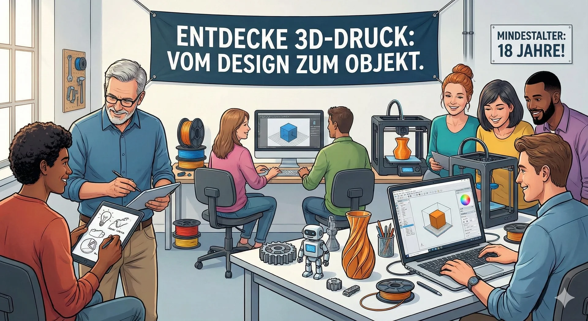 Von der Idee zum fertigen Objekt: Lerne die Grundlagen des 3D-Drucks kennen, entwirf dein eigenes Modell und drucke es direkt aus. Keine Vorkenntnisse nötig – nur Neugier!